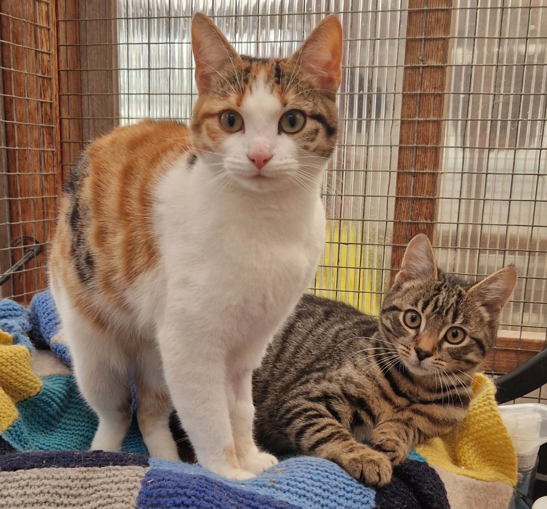 Kiki is a gorgeous calico torbie girl, and Frankie is a stunning little tabby lad.