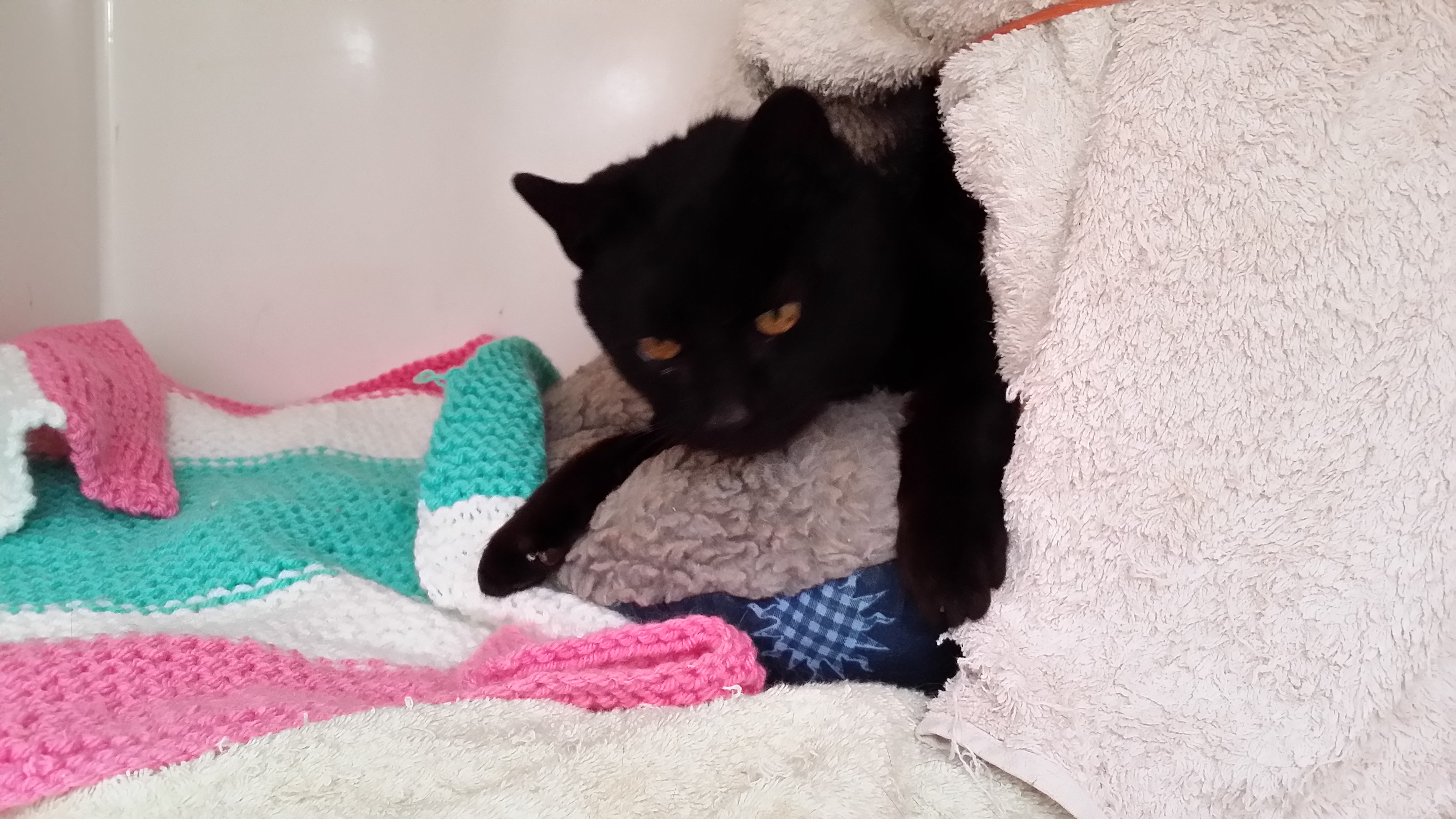 On taking her to our vets we discovered that she had suffered a dog attack and had a wide area of painful, part healed wounds. but the one on her back and side was so badly infected that had she not come into our care when she did, this poor little cat would have suffered a very painful death.