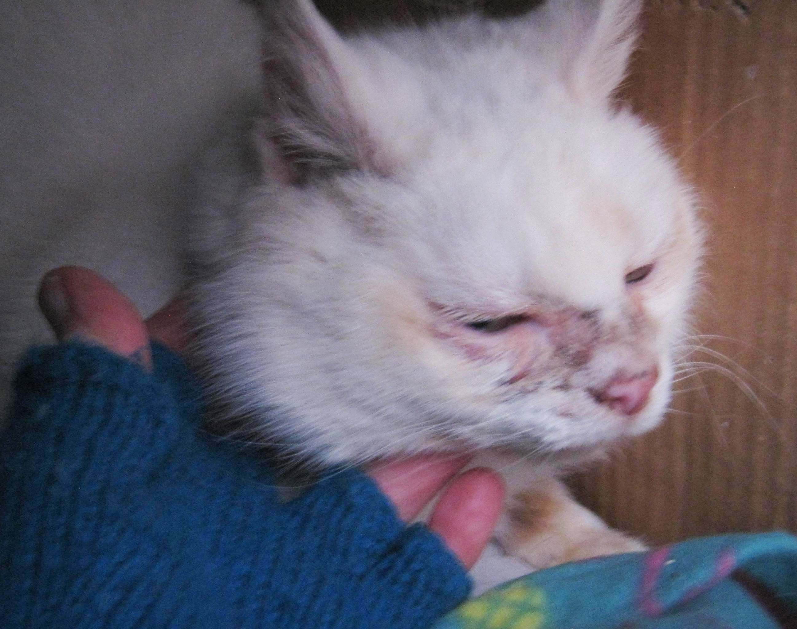 When we collected her we could immediately see that she was exhausted, wasn’t grooming herself properly as she was very dirty and she had an infection in both eyes. This had gone on for such a long time that the constant weeping of her eyes had caused damage to her fur and for it to fall out in places.
