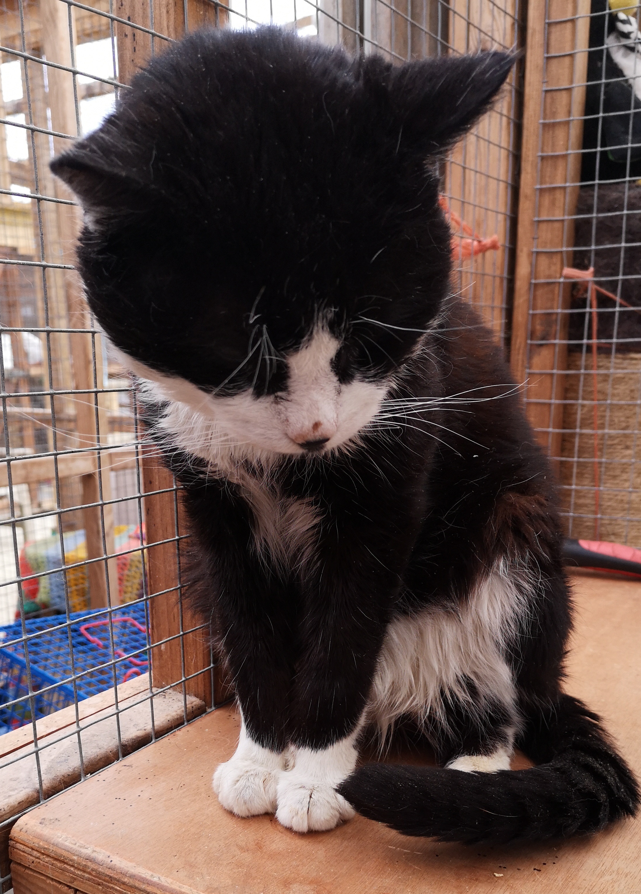 We was brought to our attention by a nice lady who was rightfully worried about him. When he came into our care he had had a terrible injury to his shoulder, his little front teeth were missing (indicating an injury of some kind as these are normally the last teeth a cat loses), he was painfully thin to the point where his head seemed too big for his body, greasy and dirty and utterly exhausted. He was also unneutered which will have made him more of a target for other unneutered males, battling for survival in the same way.