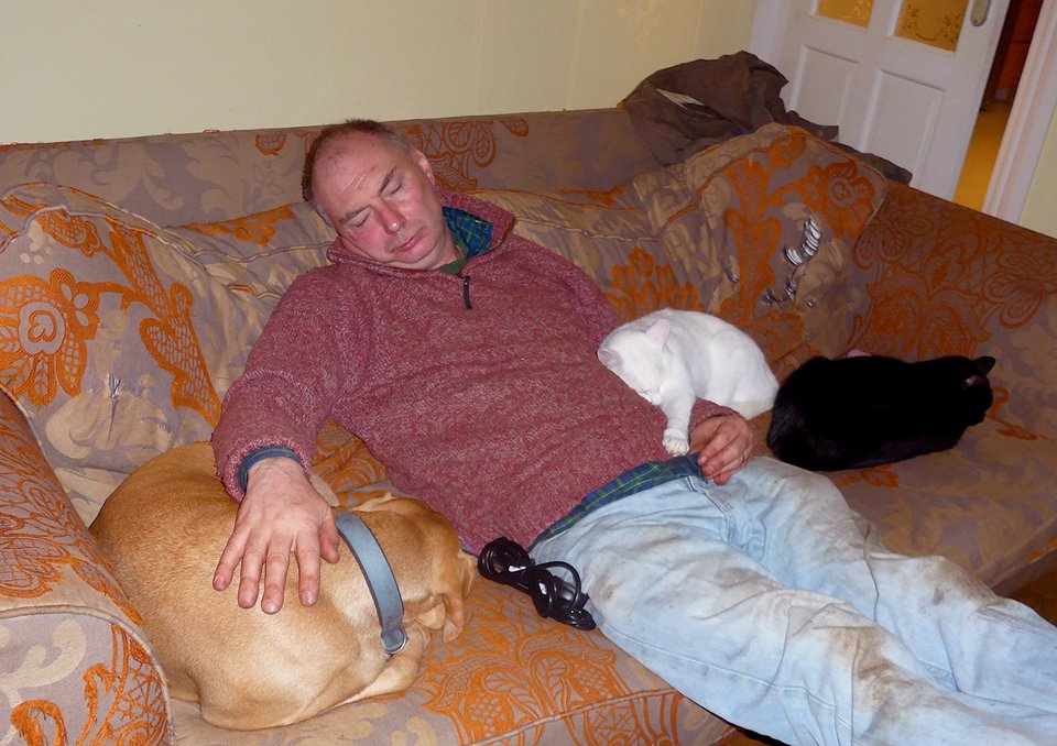 Hazel and Les are pictured here having a well earned rest after a 12 mile practice session! along with their feline friends Harvey and Ruby.