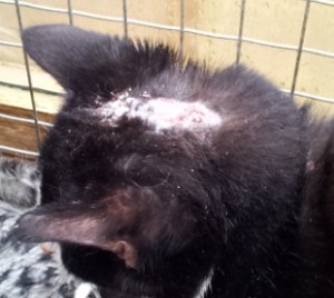 When they arrived we could clearly see how awfully neglected they were. They both had a terrible ear mite infestation which had gone untreated. Jenny had such dreadful ear mites that she had scratched her head to the extent that she had badly injured her skin. She had no fur covering the top of her head and the whole area was a large, weeping sore. (By the time we took this picture, she was undergoing treatment and it was much improved).