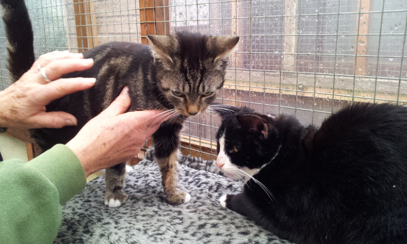 In late October 2013 Jenny and Paddy were found on a doorstep, in a taped up box. When the lady who discovered them undid the box, she was horrified to see two undernourished, dehydrated young cats, Jenny around two years old and Paddy under a year old. She began telephoning rescue centres and after having no luck finding a place for them, she thankfully called us at Rolvenden where we were able to take them into our care.